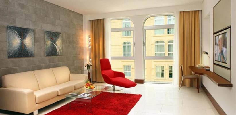 - Burj Suite. Просторный люкс площадью 67 кв. м, с одной кроватью размера king-size и просторной гостиной. Максимальное размещение 4 чел.