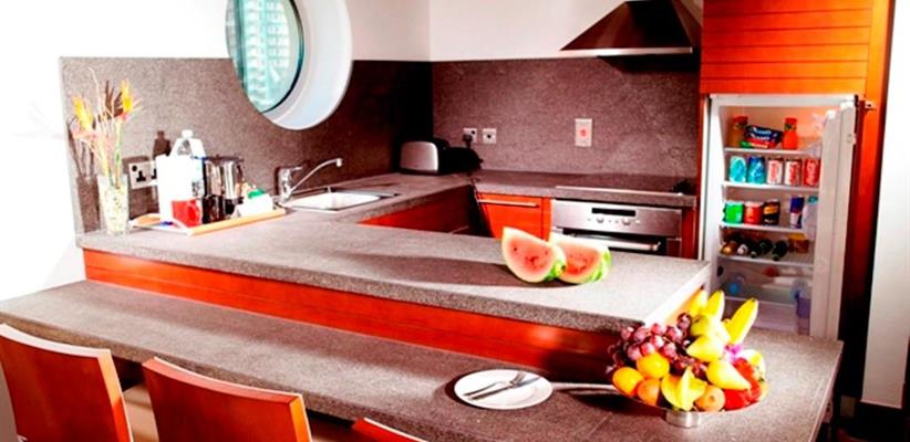 - Premium Suite площадью 67 кв. м. Из окна открывается живописный вид на море, а в комнатах для отдыха и размещения гостей установлена кровать размера king-size и два удобных дивана.