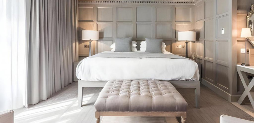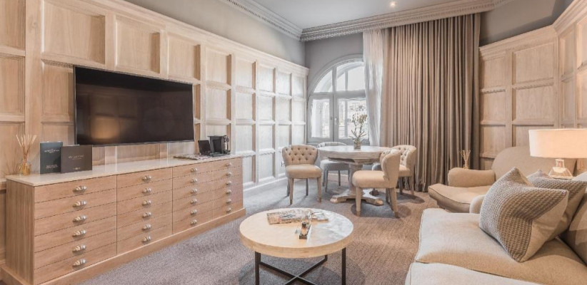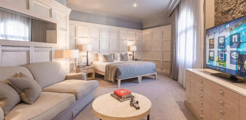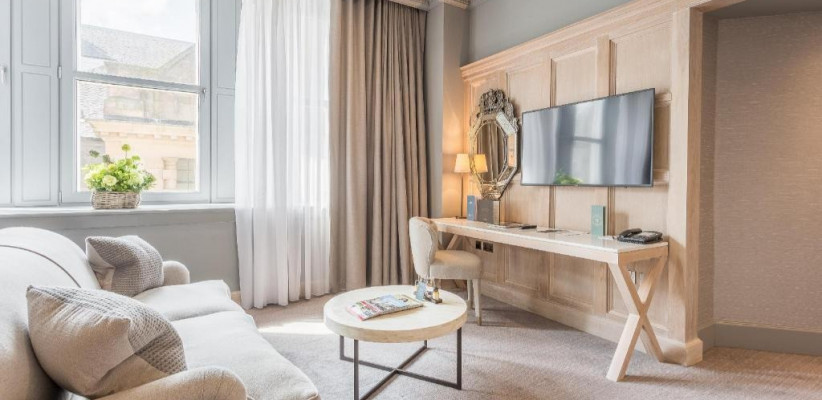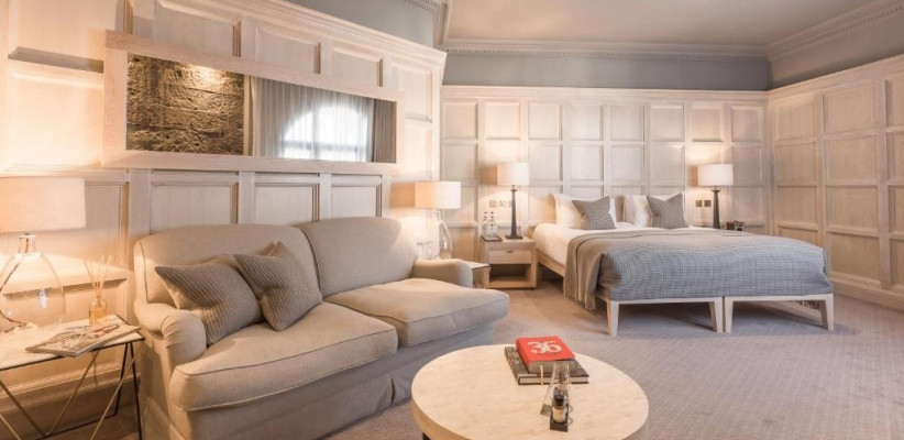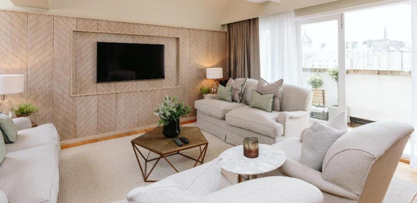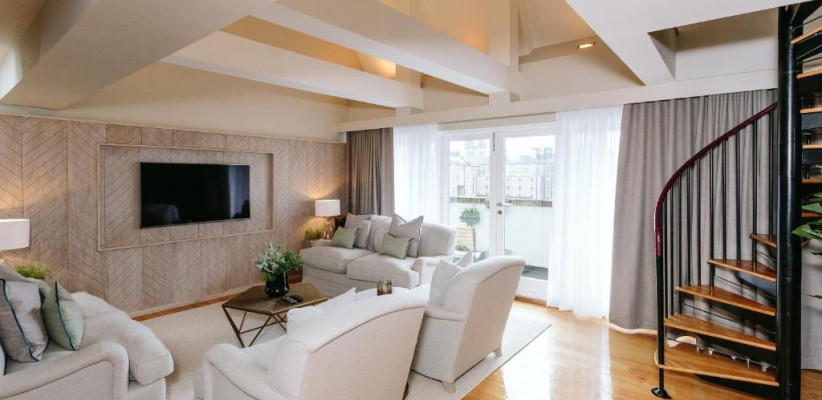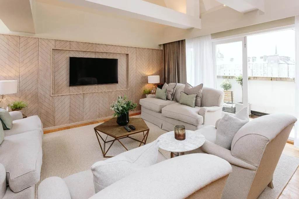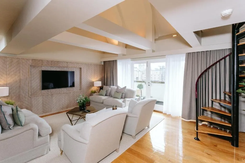 просторная люксовая квартира на крыше отеля с панорамными видами на Эдинбургский замок и Старый город, 2 спальни, двуспальные кровати, гостиная зона, количество гостей: 4–5Publisher Suite
