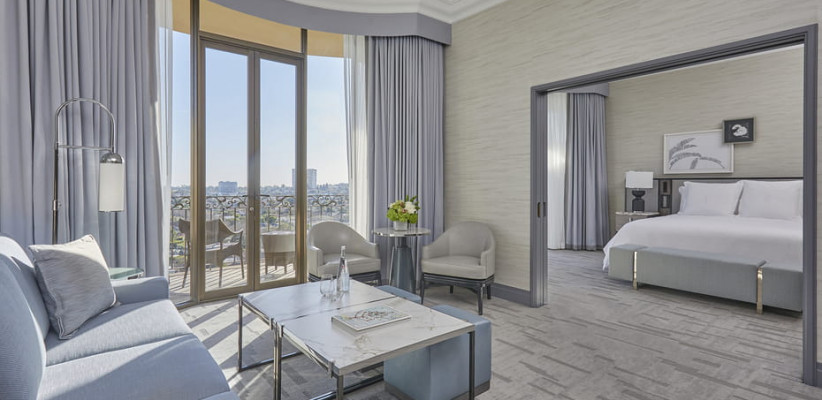 67 м2, вид на главный вход, двуспальная кровать, гостиная, гардеробная.Расположены со 2 по 10 этаж крыла Beverly WingOne-Bedroom Beverly Suite with Balcony and View