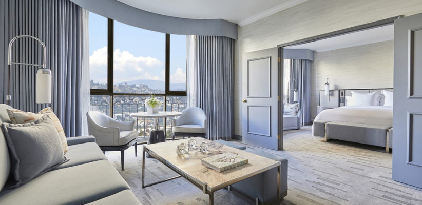 70 м2, терраса, вид на Голливудские холмы и улицу Родео-драйв, спальня (двуспальная кровать) с гостиной зоной, гардеробная. Расположен на 10 этаже крыла Wilshire WingOne-Bedroom Wilshire Suite