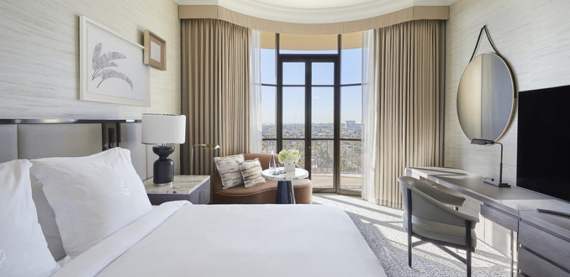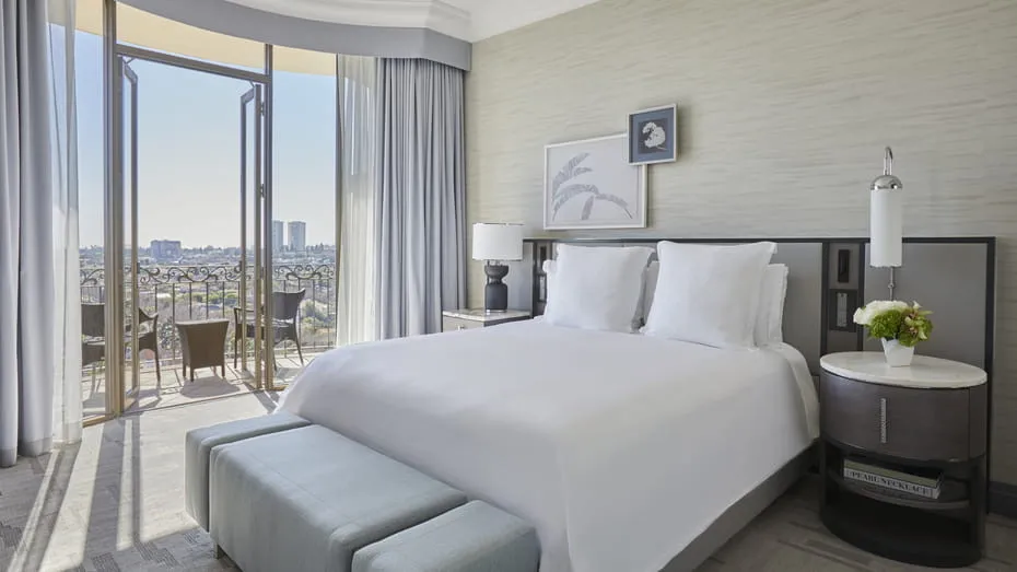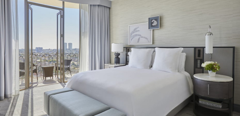 132 м2, балкон, вид на Беверли-Хиллз и район Century City, спальня с двуспальной кроватью, гостиная, гардеробная, ванная комната, гостевой санузел. Расположен на 14 этаже крыла Beverly WingGovernor Suite