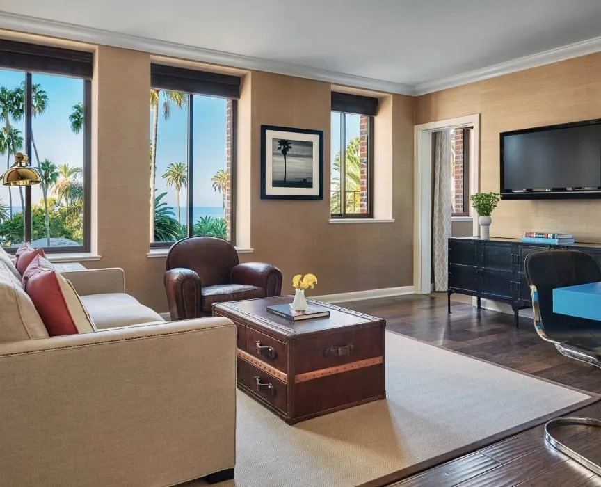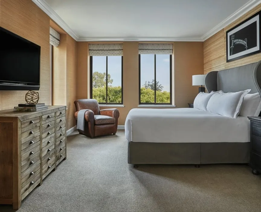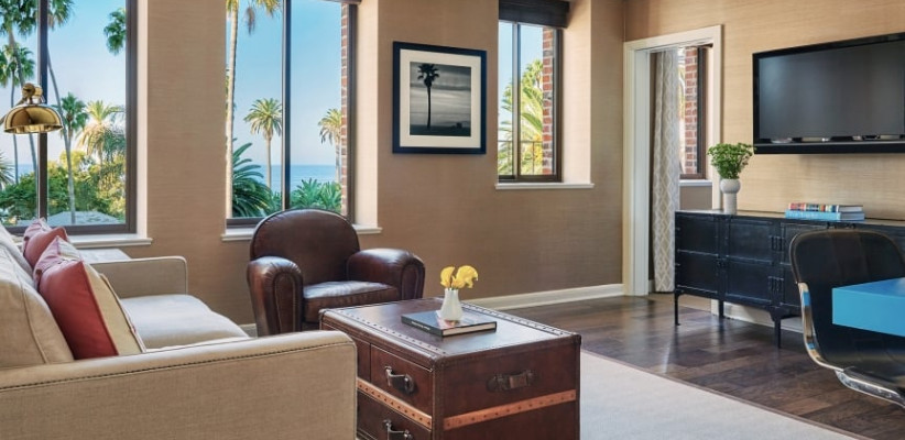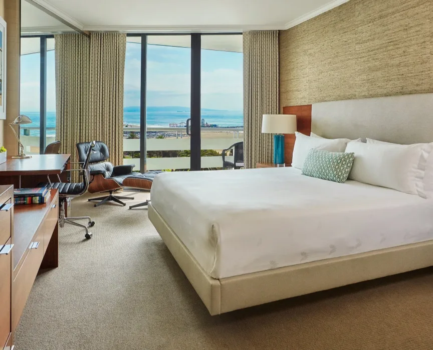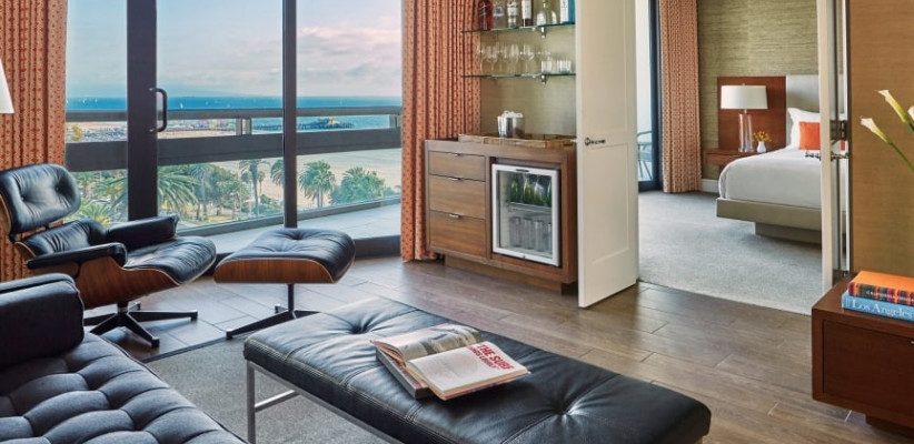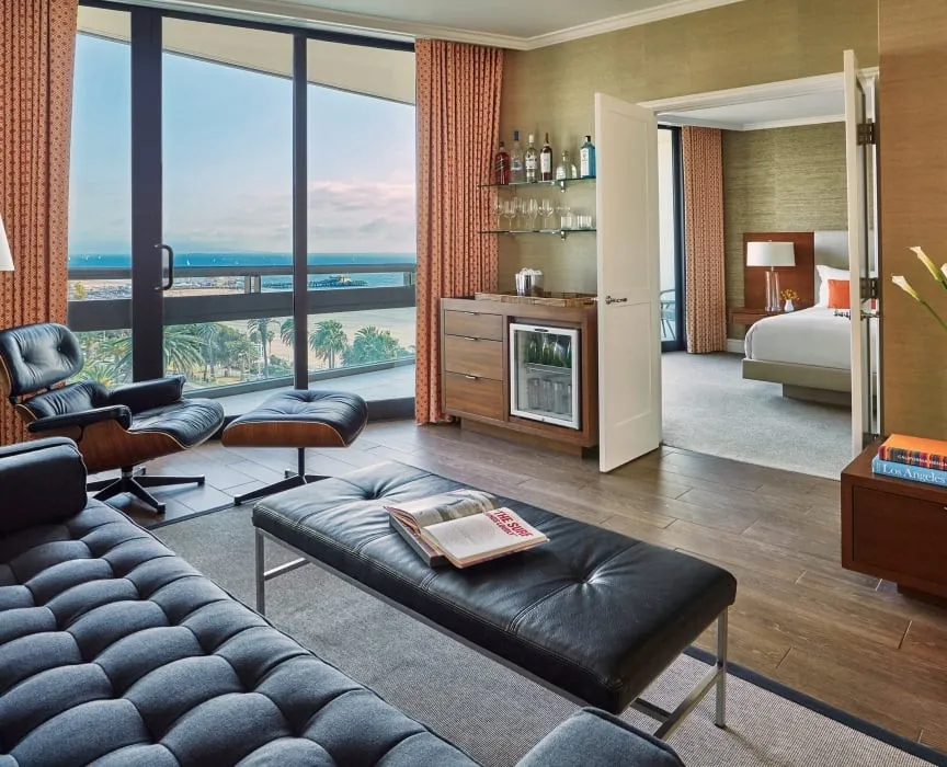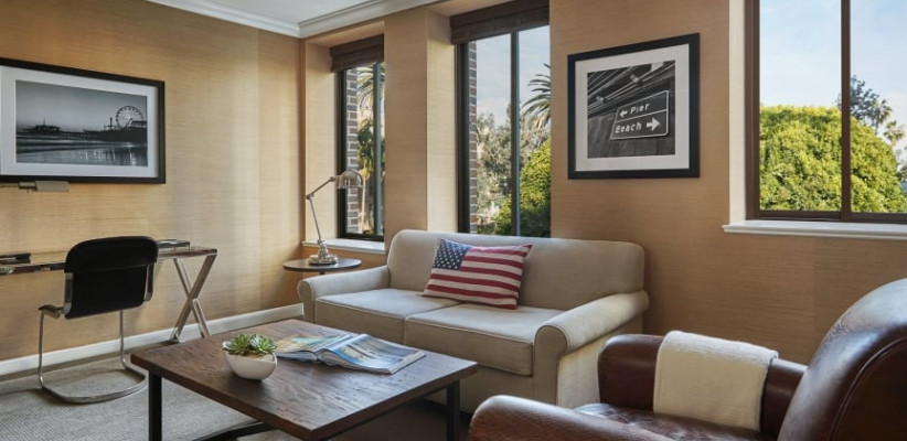 26 м2, балкон с фронтальным видом на океан, Малибу или пирс Санта-Моники, двуспальная кровать или две односпальные кровати, зона отдыха. Номер оформлен известным дизайнером из Лос-Анджелеса Линдой Мюррей, расположен в здании Ocean TowerPalisades Suite