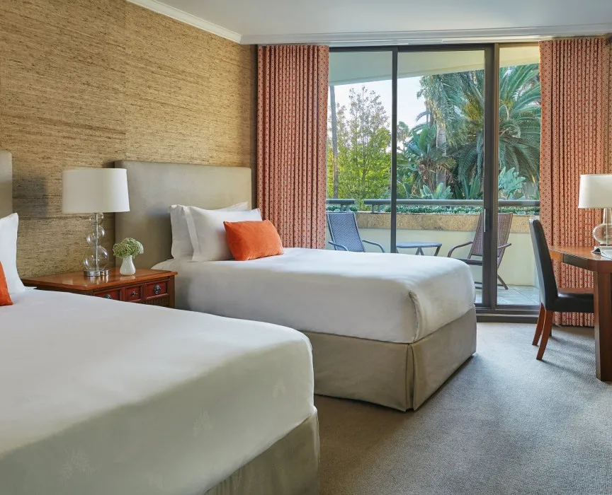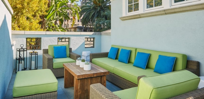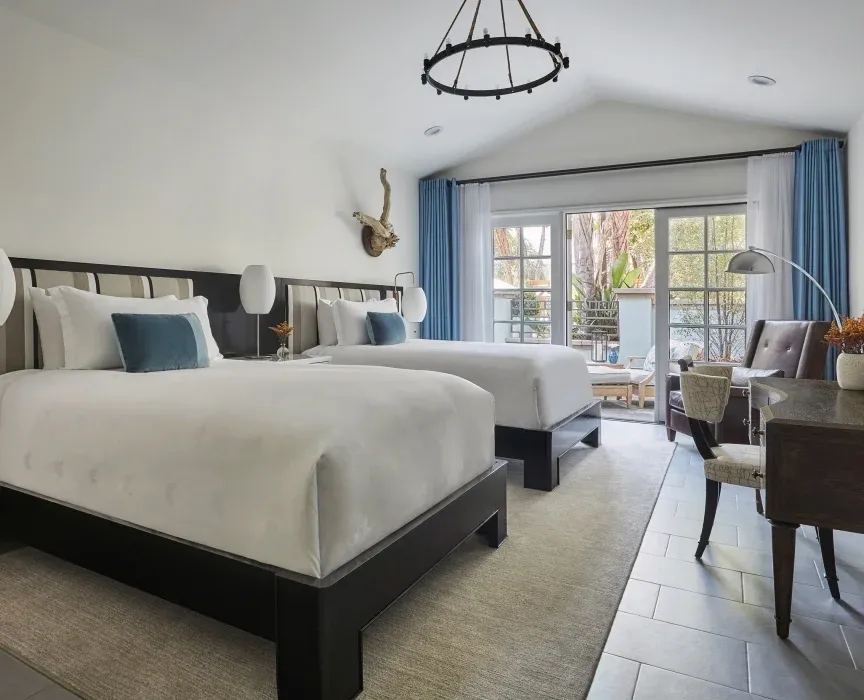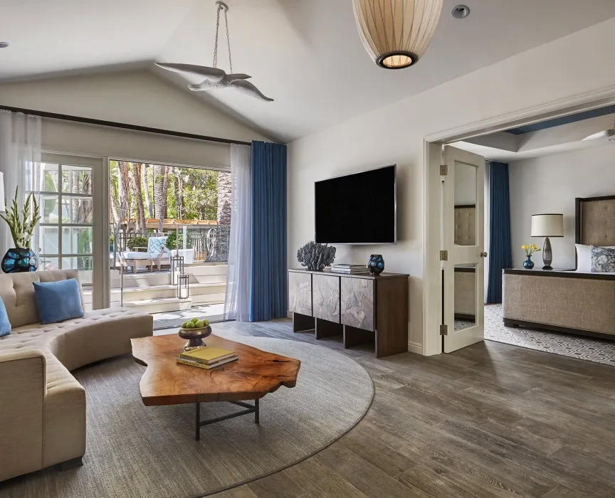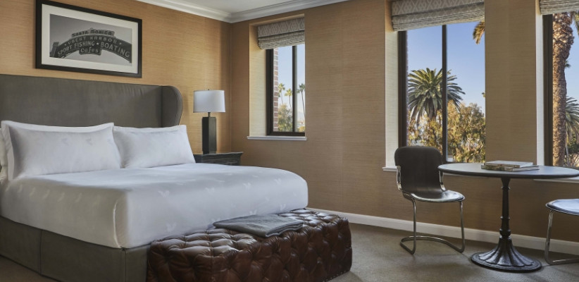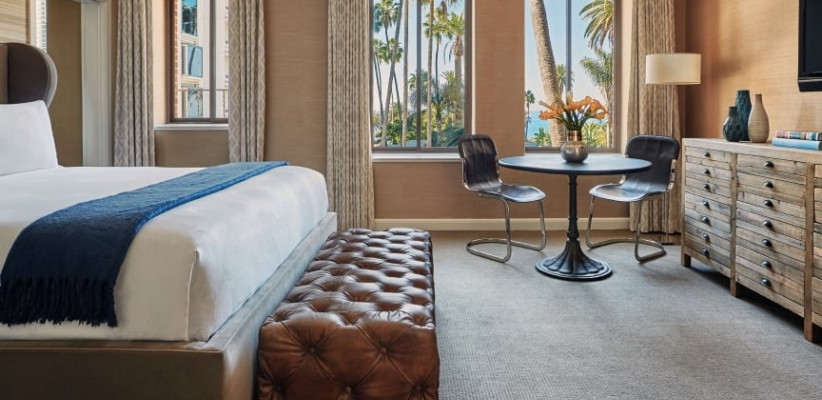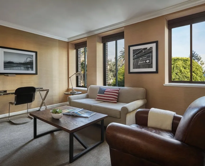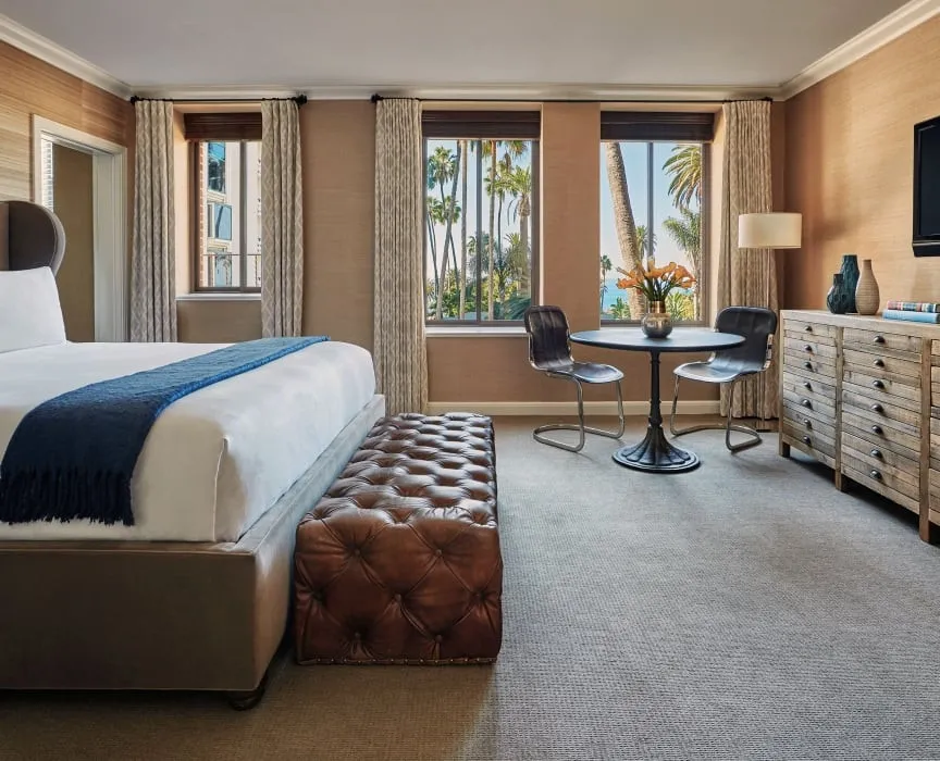 26 м2, балкон с фронтальным видом на океан, Малибу или пирс Санта-Моники, двуспальная кровать или две односпальные кровати, зона отдыха. Номер оформлен известным дизайнером из Лос-Анджелеса Линдой Мюррей, расположен в здании Ocean TowerPalisades Suite