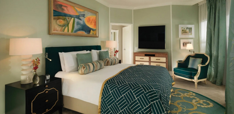 117 м2, спальня с двуспальной кроватью размера king-size, гостиная зона с камином, обеденная зона, рабочее место.Paul R. Williams Suite