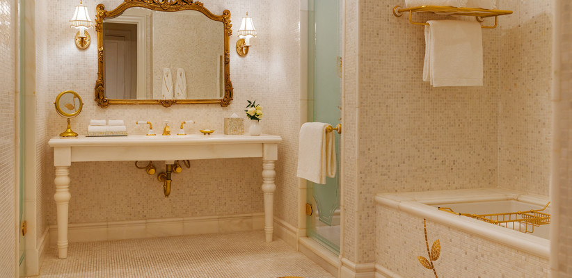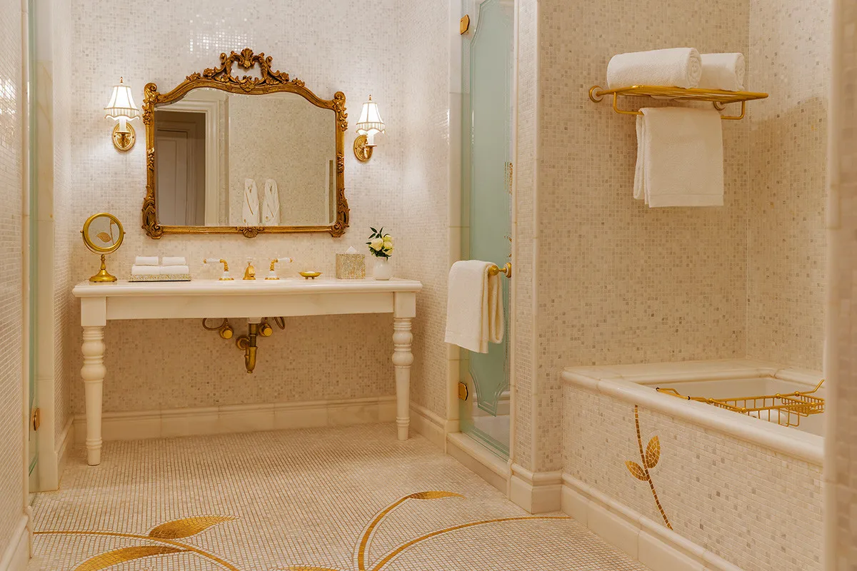 68 м2, спальня с двуспальными кроватями размера queen-size, гостиная зона с диваном, рабочее место, отдельная кладовая, ванная комната с мозаичным полом и стенами с позолоченным цветочным мотивом, 12-18 этажи.