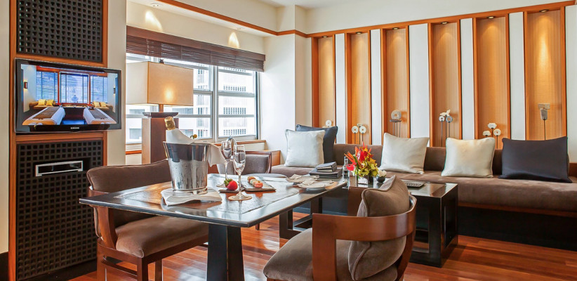 64 м2, спальня с двуспальной кроватью размера king-size, софа, гостиная зона, обеденная зона.One Bedroom Suites