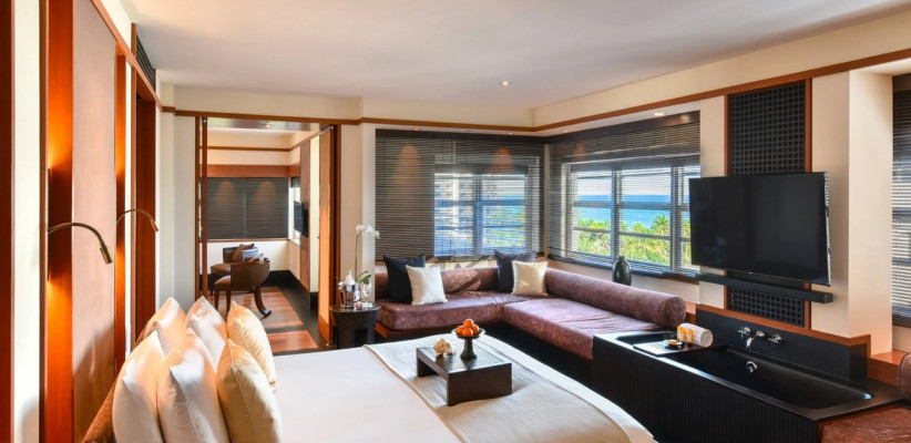 73 м2, балкон с видом на океан, внутренний двор или город, спальня с двуспальной кроватью размера king-size, софа, обеденная зона.One Bedroom Ocean Suites