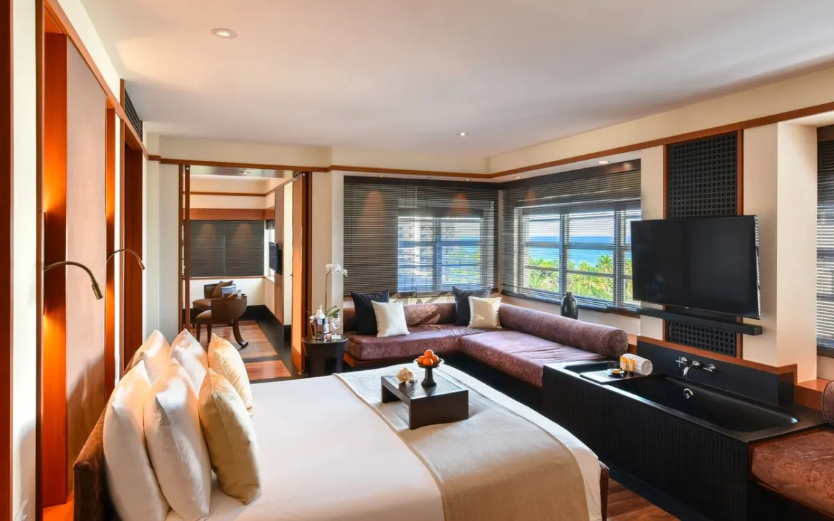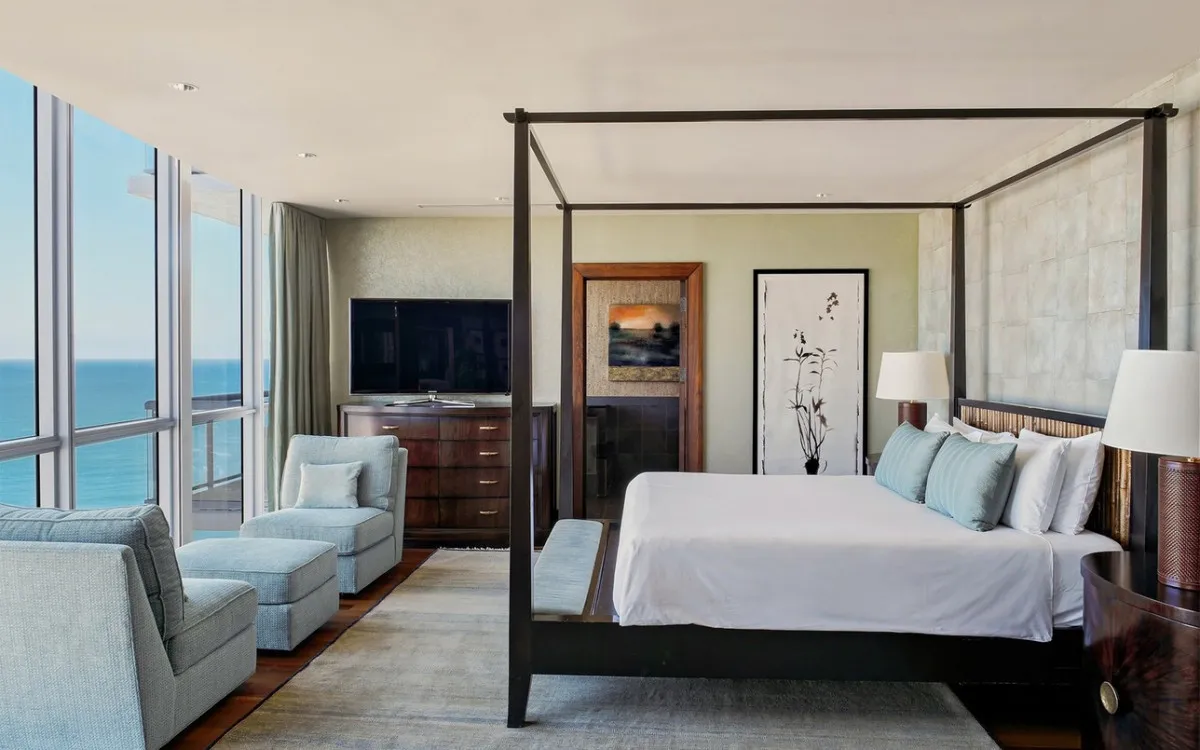 162 м2, балкон с видом на океан, спальня с двуспальной кроватью размера king-size, гостиная, обеденная зона, оборудованная кухня, рабочее место.The Grand Suite
