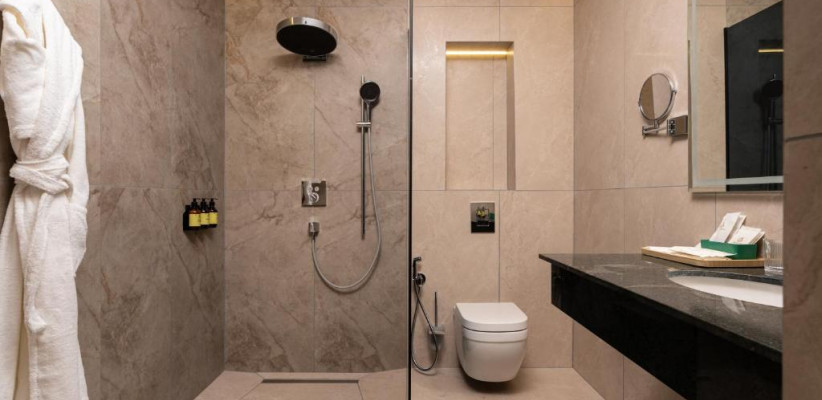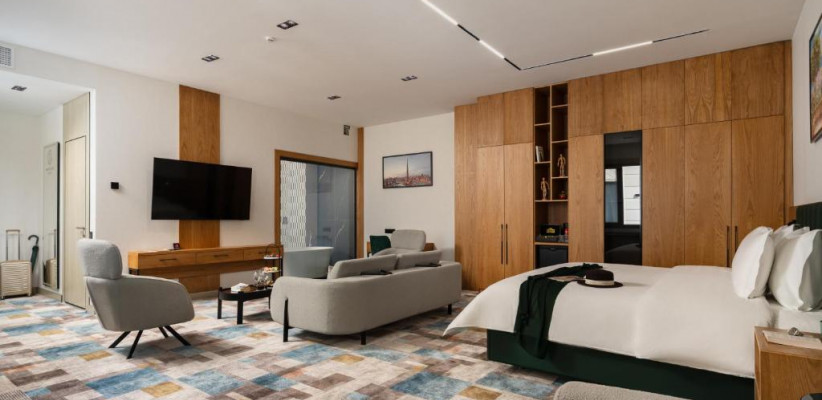 75 м2, с панорамным видом на город. В номере: одна двуспальная кровать, отдельная гостиная, обеденная зона. Максимальное количество гостей: 4