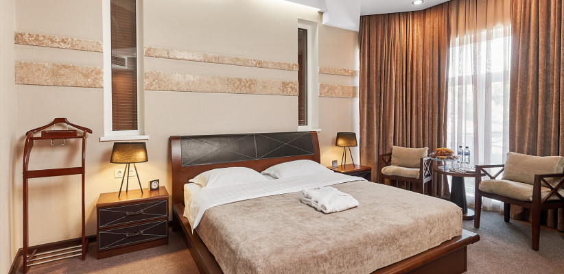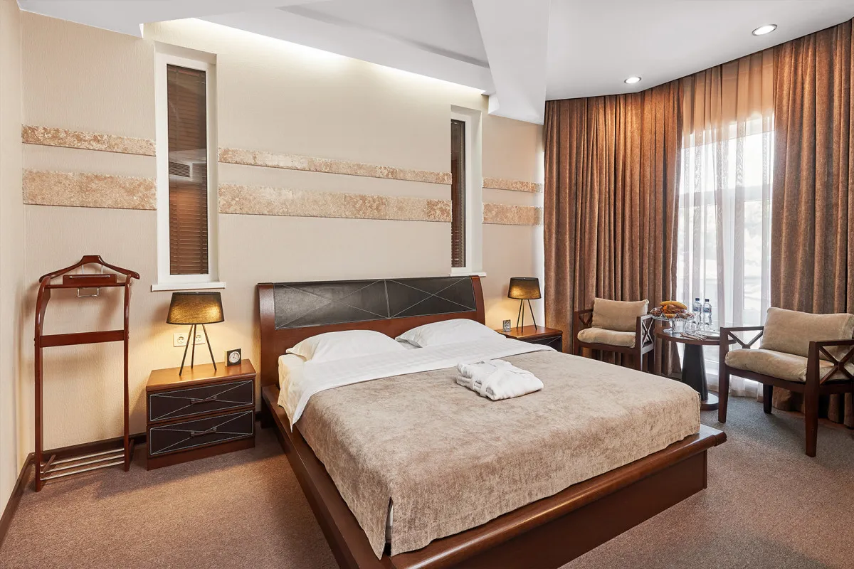 в номере двуспальная кровать, рабочий стол, кофейный столик и кресла, шкафы и комоды.Люкс