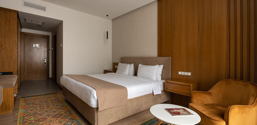 26 м2, с балконом или без, спальня с двуспальной кроватью размера king-size, односпальная кровать, кресло, рабочее место.