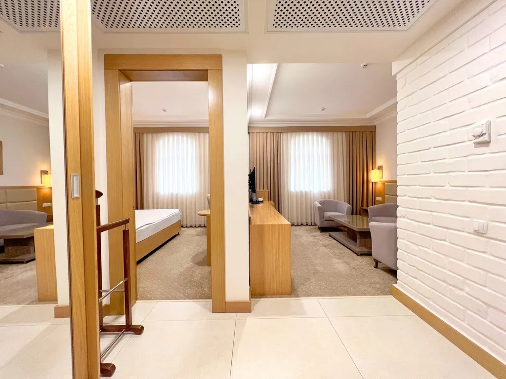40 м2, спальня с двуспальной кроватью размера king-size или с двумя односпальными кроватями, гостиная зона. Максимальное количество гостей: 2.Suite Room