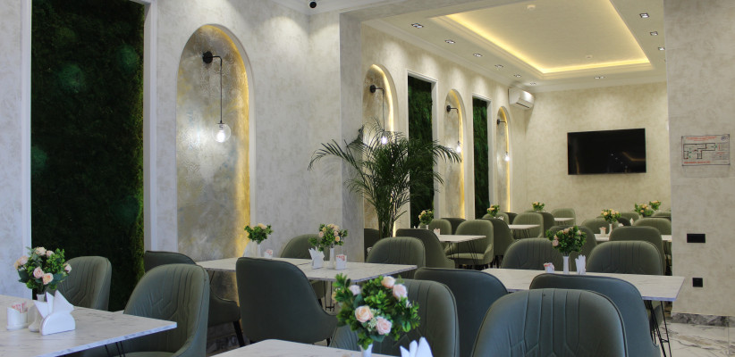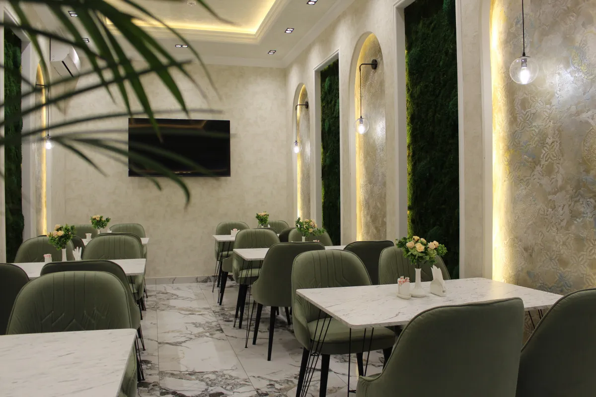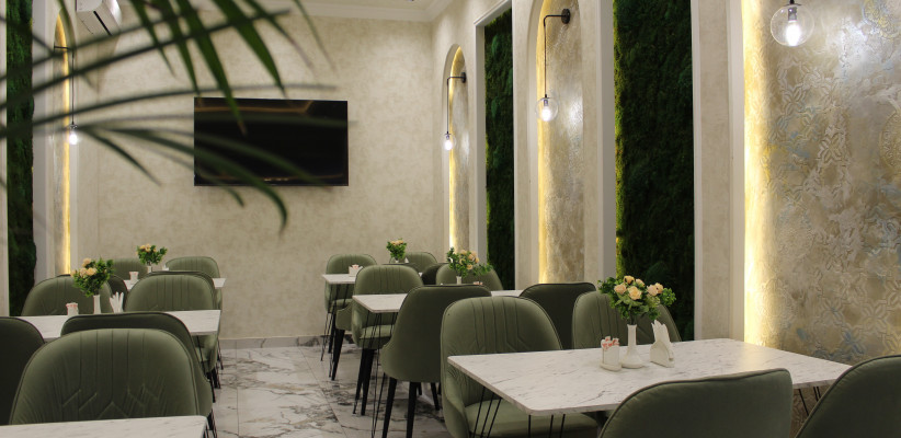 Ресторан с живыми настенными растениями предлагает изысканные блюда от шеф-повара.