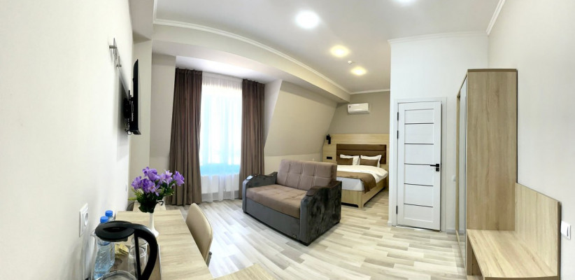 номер с современным дизайном, одной двуспальной кроватью и диваномТрёхместный