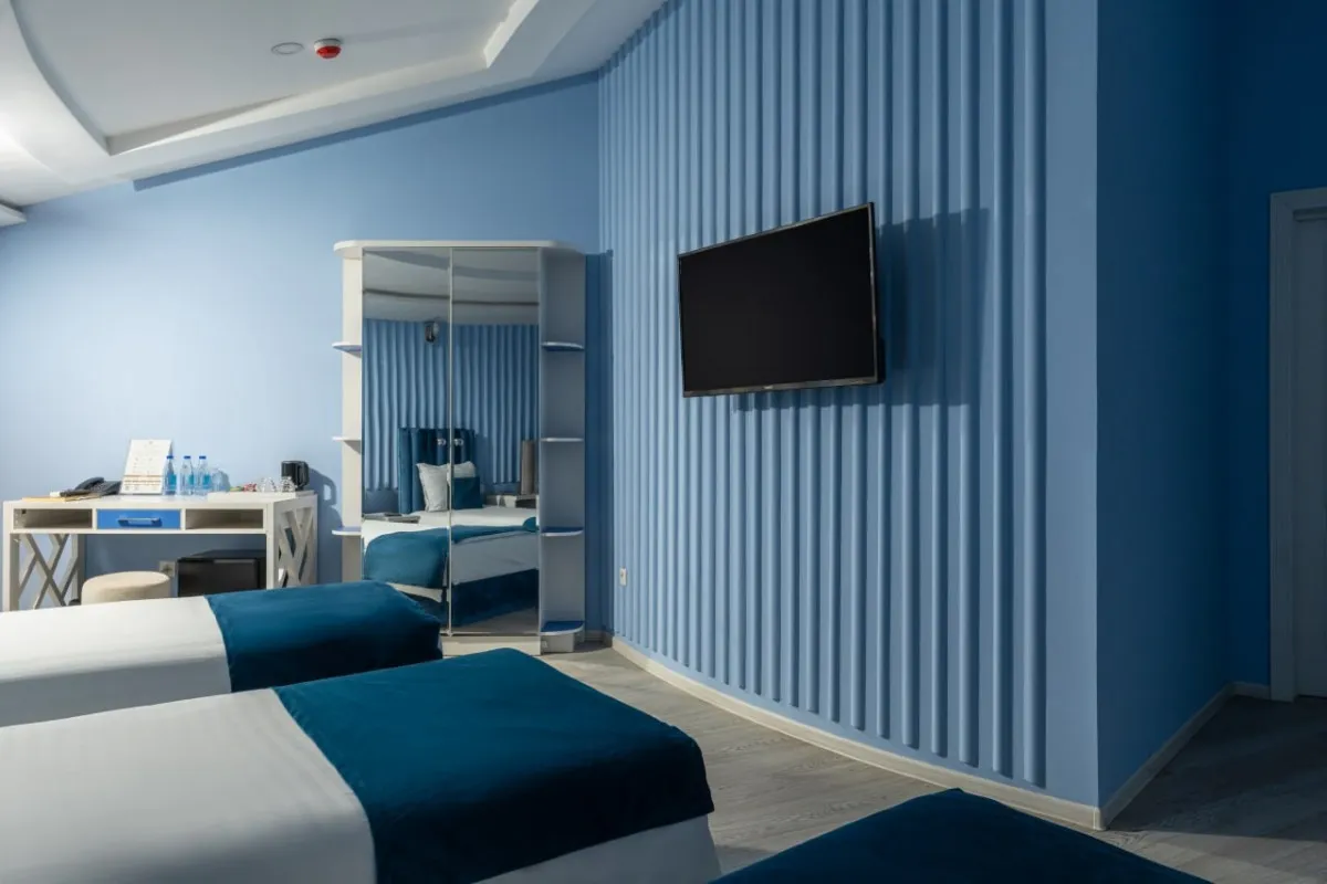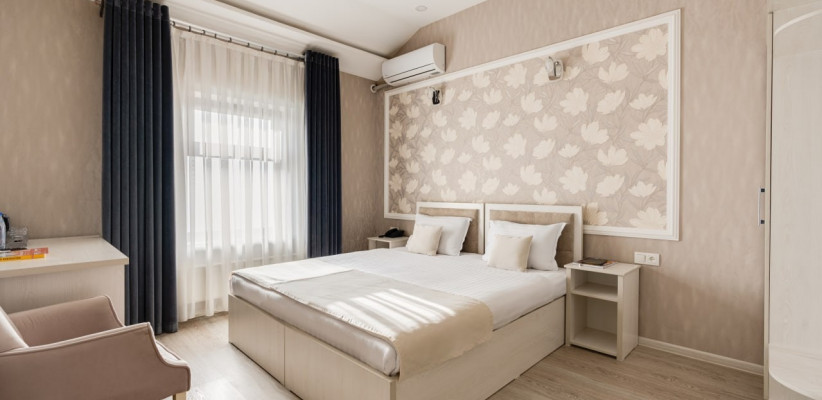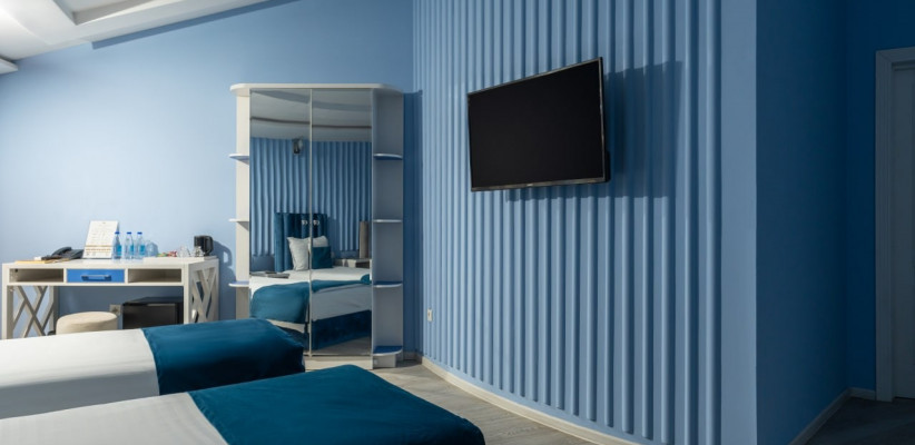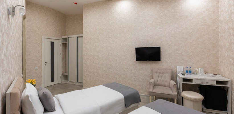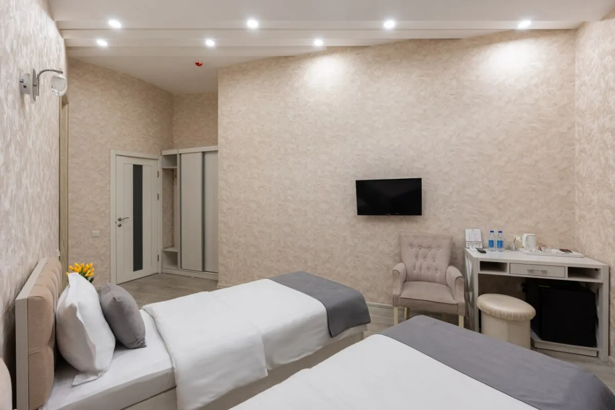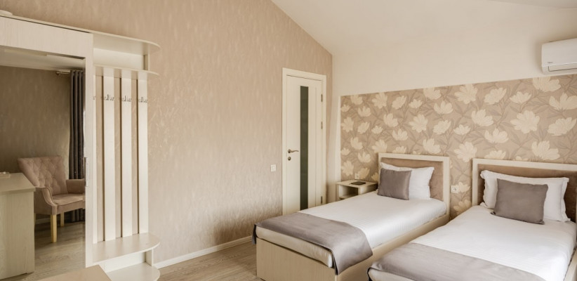 спальня с двуспальной кроватью размера king-size или с двумя односпальными кроватями, кресло, рабочее место. Максимальное количество гостей: 2.Triple Room/ Трехместный