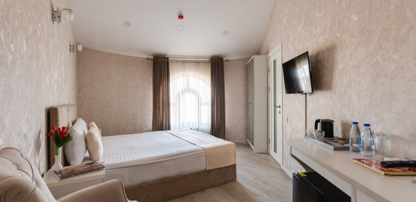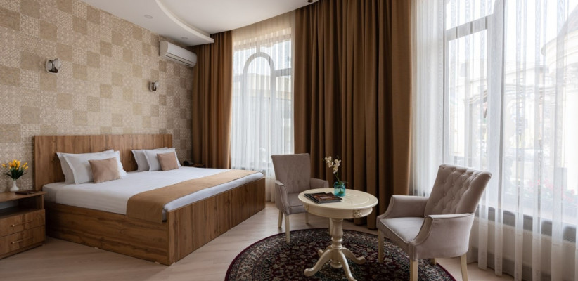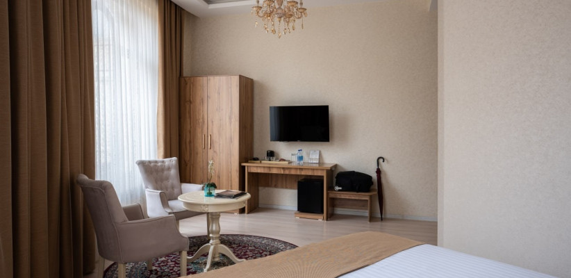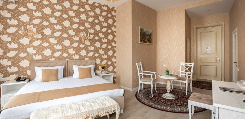 спальня с двуспальной кроватью размера king-size, два кресла с кофейным столиком, рабочее место. Максимальное количество гостей: 5.Luxe Double Room/ Люкс