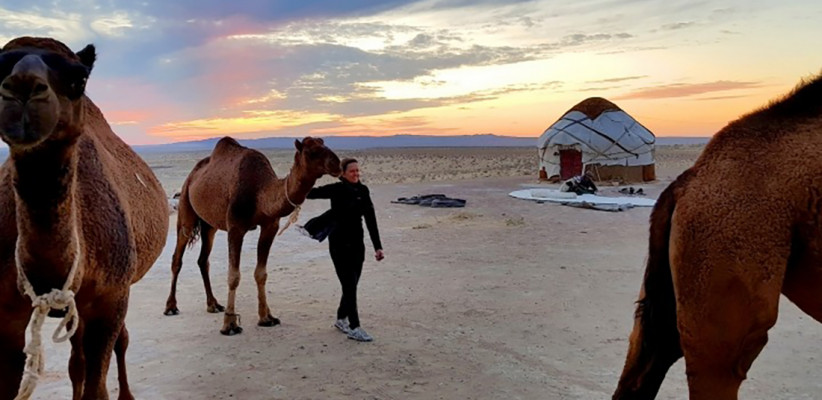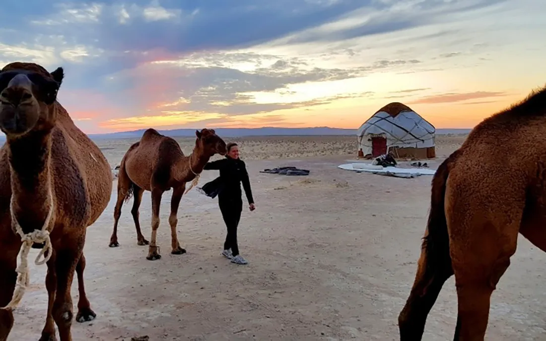 Далее переезд в юртовый лагерь, расположенный в пустыне Кызылкум. Прибытие, размещение в юртах, свободное время, вечерняя прогулка на верблюдах по пустыне. Ужин у костра, музыкальное сопровождение песнями Акына (народного певца).