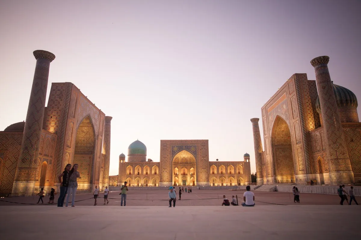 Экскурсия по Самарканду: самая известная площадь Центральной Азии – Регистан, окруженная тремя монументальными медресе – Шер-Дор, Тилля-Кари и медресе Улугбека; мавзолей Гур-Эмир – грандиозная династическая усыпальница Тамерлана, послужившая прототипом  для мавзолеев Хумаюн в Дели и Тадж-Махал в Агре; самая большая в Центральной Азии соборная мечеть, исполненная царственности и красоты – Биби-Ханум; крупнейший рынок Самарканда – базар Сиаб; архитектурный ансамбль из 11 средневековых мавзолеев – Шахи-Зинда, музей обсерватории Улугбека – одной из самых значительных обсерваторий Средневековья, где под землей сохранился фрагмент гигантского угломера (секстанта).