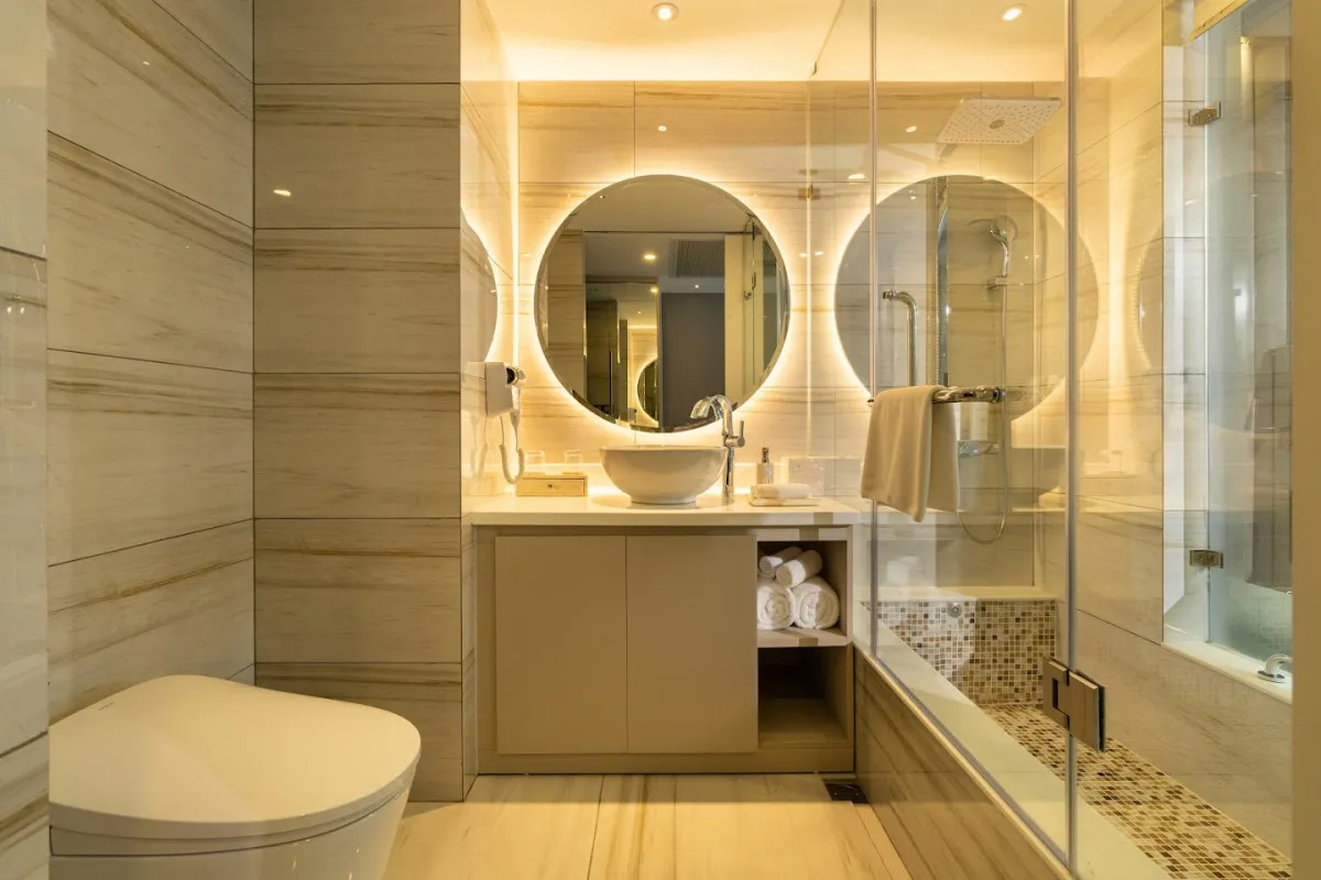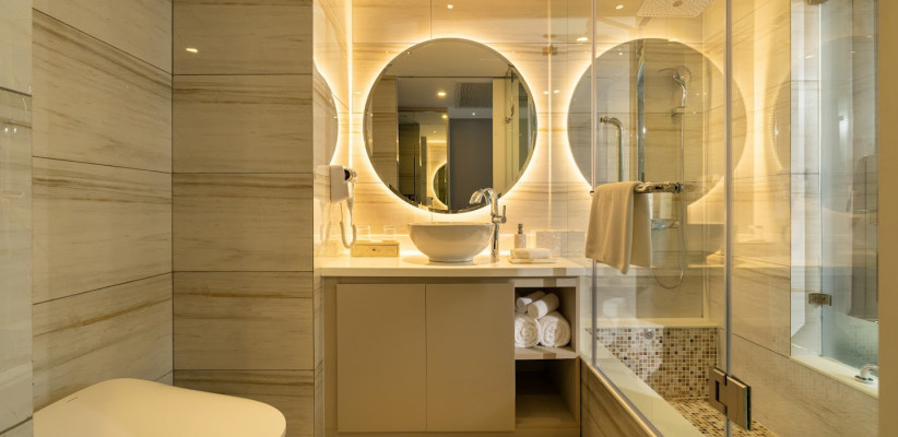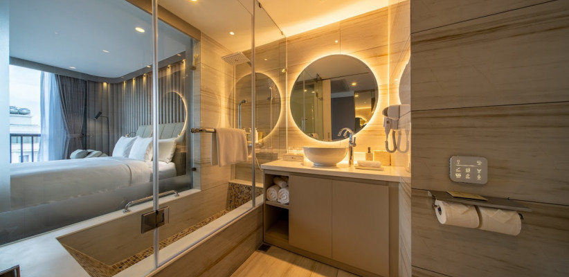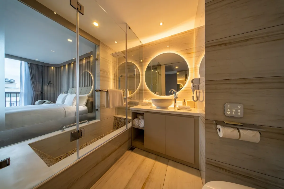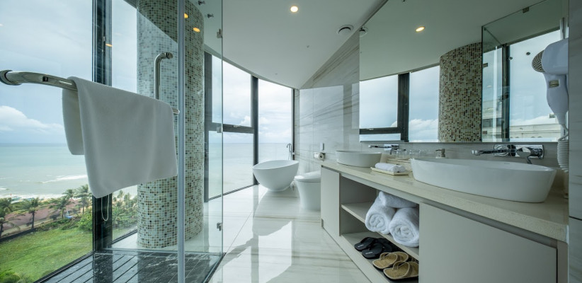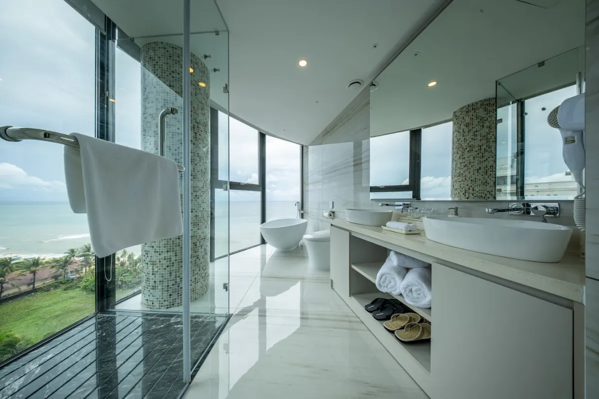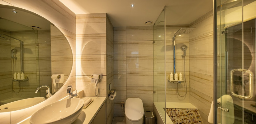 - отдельный туалет со стеклянной перегородкой и душ "тропический дождь"