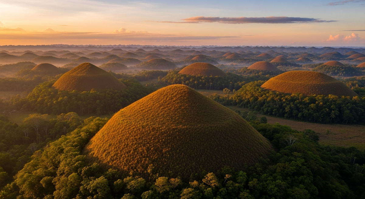 Эта необычная достопримечательность находится в провинции Бохоль. На территории в 50 км2 расположено более 1200 холмов, похожих на конфеты. Обычно они покрыты зеленой травой, но в период сухого сезона растительность меняет цвет на коричневый. В итоге туристам трудно избавиться от ощущения, что они видят перед собой шоколадные горки, которые так и хочется сфотографировать. Сами филиппинцы считают эти холмы третьим по значению геологическим памятником своей страны.