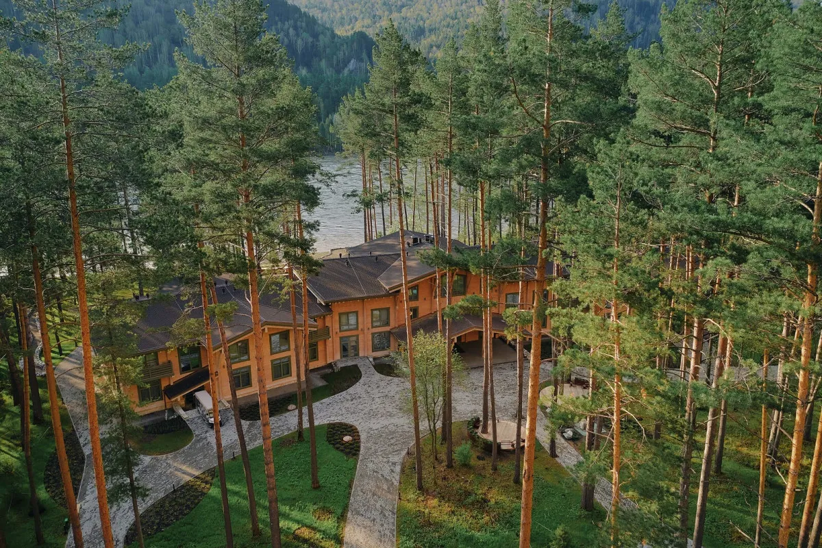 Отель словно вырастает из хвойного леса на первой береговой линии Катуни, и вся суета растворяется в ветре с горных хребтов и чистом воздухе. Благодаря близости гор Семинского хребта здесь создается особый микроклимат. Архитектура аккуратно вписана в ландшафт: главное здание с номерами и 21 уютное шале окружают высокие деревья, в некоторых жилищах сделаны специальные проемы для многолетних стволов.