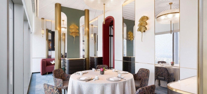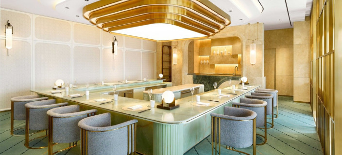 Отель проектировался бельгийским архитектором Жан-Мишелем Гати; он воплотил концепцию «альпийского шика» с азиатскими нюансами, используя симметрию, богатую отделку и приглушённое освещение. Фасад здания напоминает традиционное швейцарское шале, но с современной эстетикой. Дизайн интерьеров вдохновлён атмосферой онсэнов (японских термальных источников).